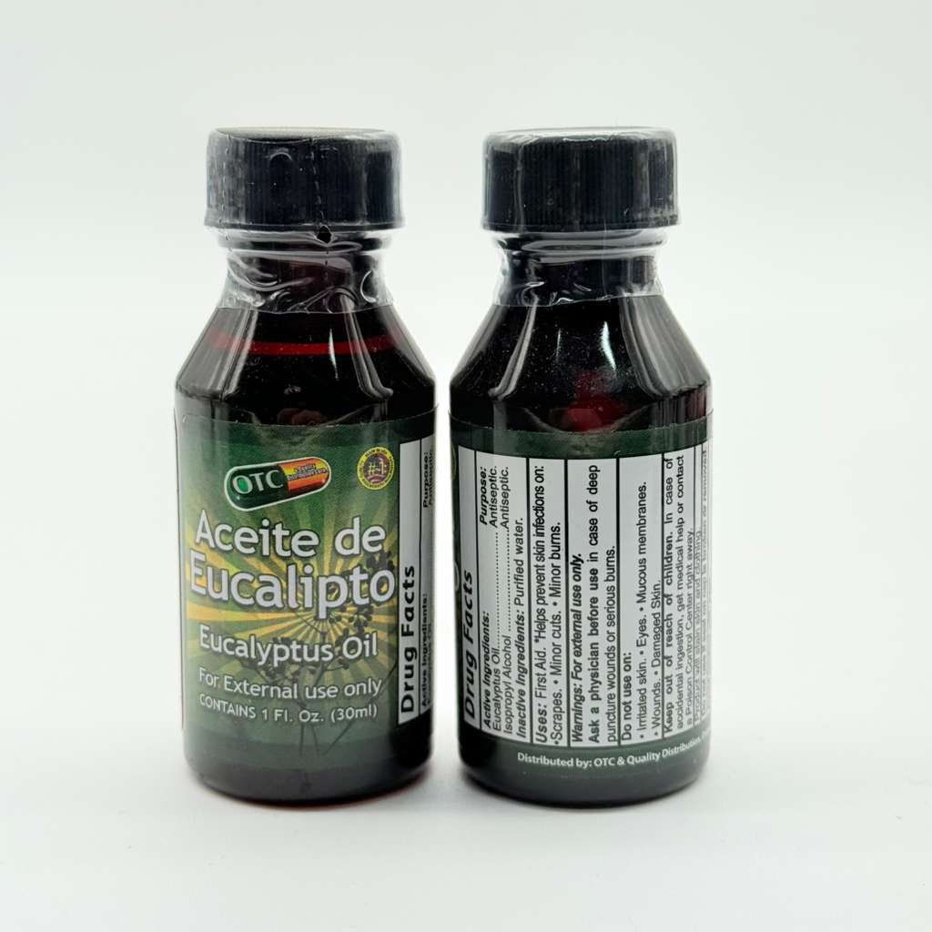 Aceite de eucalipto para uso externo, ideal como antiséptico y para aliviar irritaciones menores. Aroma intenso y refrescante.