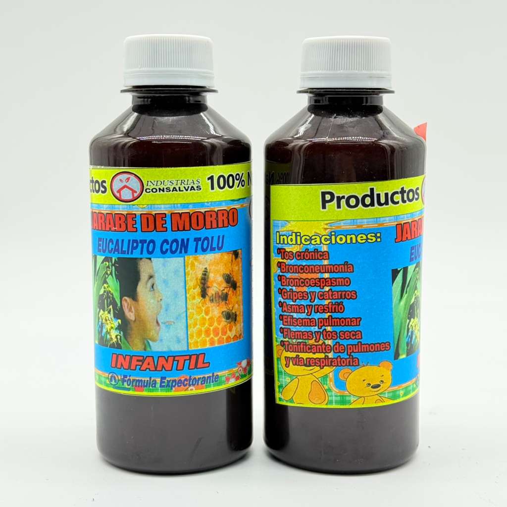 Jarabe expectorante para niños formulado para aliviar tos crónica, gripe, broncoespasmo y acumulación de flemas. Contiene ingredientes tradicionales como morro, miel y eucalipto.